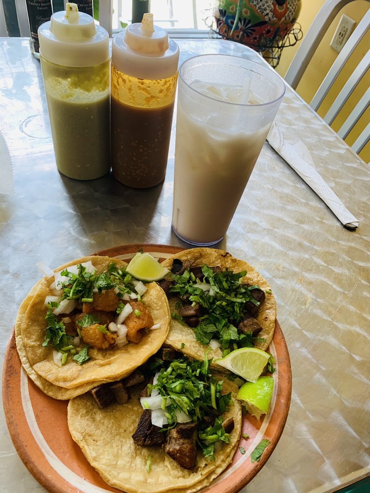 Four corn tortillas rolled up with choice of meat topped with salsa verde or roja, lettuce, pico de gallo, sour cream, avocado, cotija cheese.