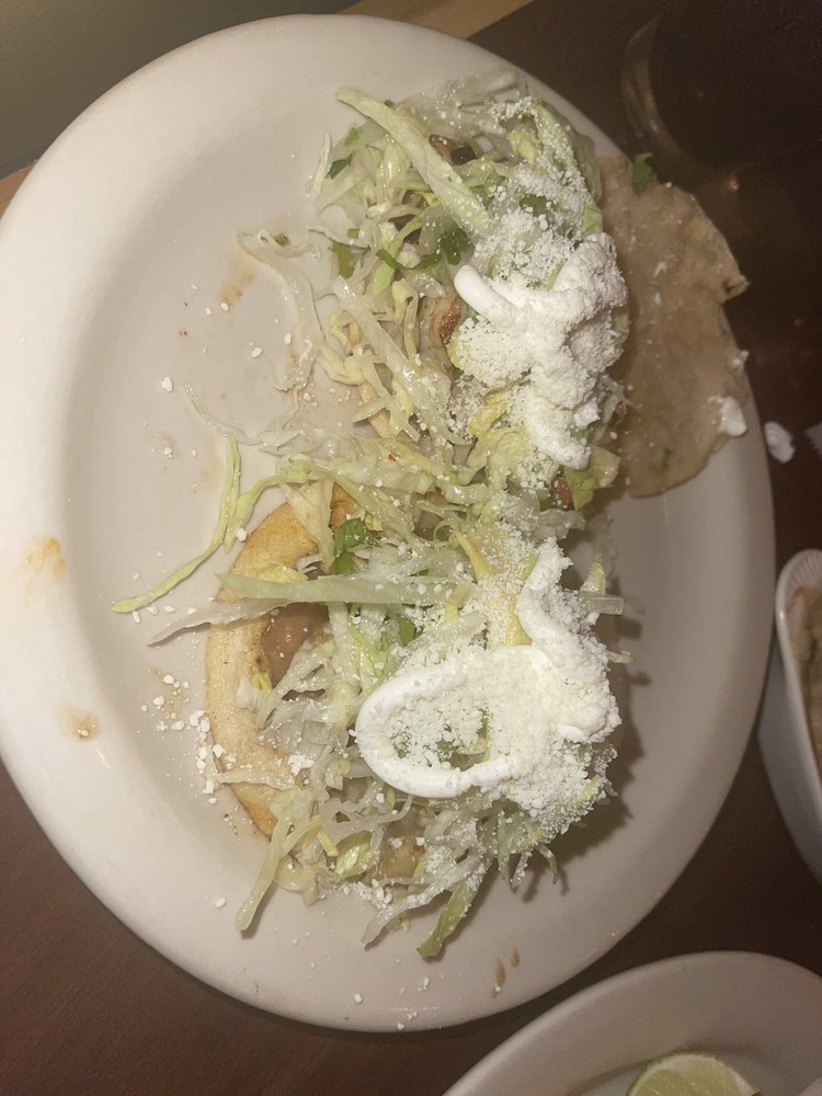 Handmade tortilla with choice of meat, beans, lettuce, avocado, sour cream and cotija cheese.
