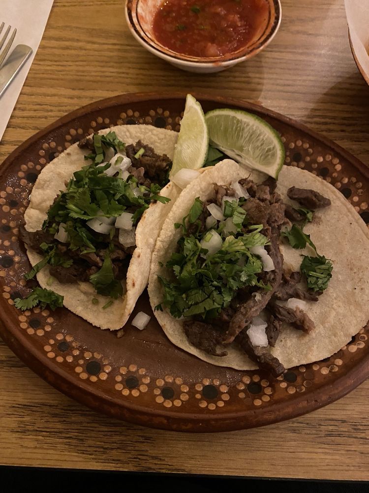 Corn tortillas dipped in consome crisped on grill with barbacoa, shredded cheese, cilantro, onions and small bowl of consome (dipping sauce).